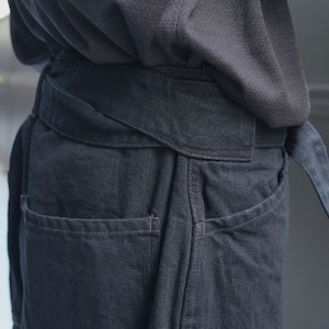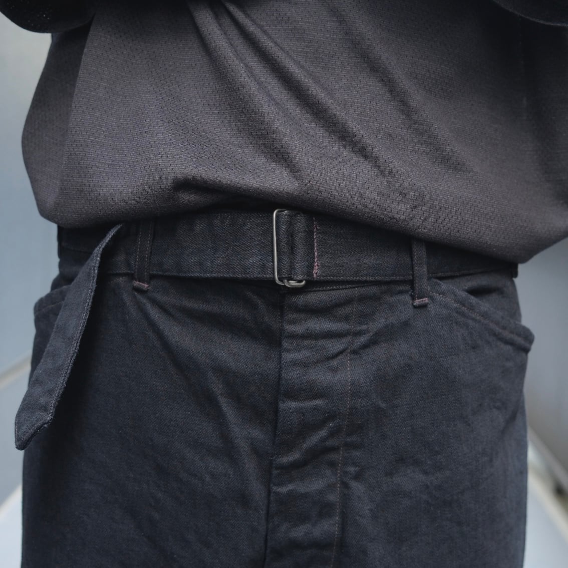 スモーキーな色とドライタッチなブラックデニムのベルテッドパンツです。
