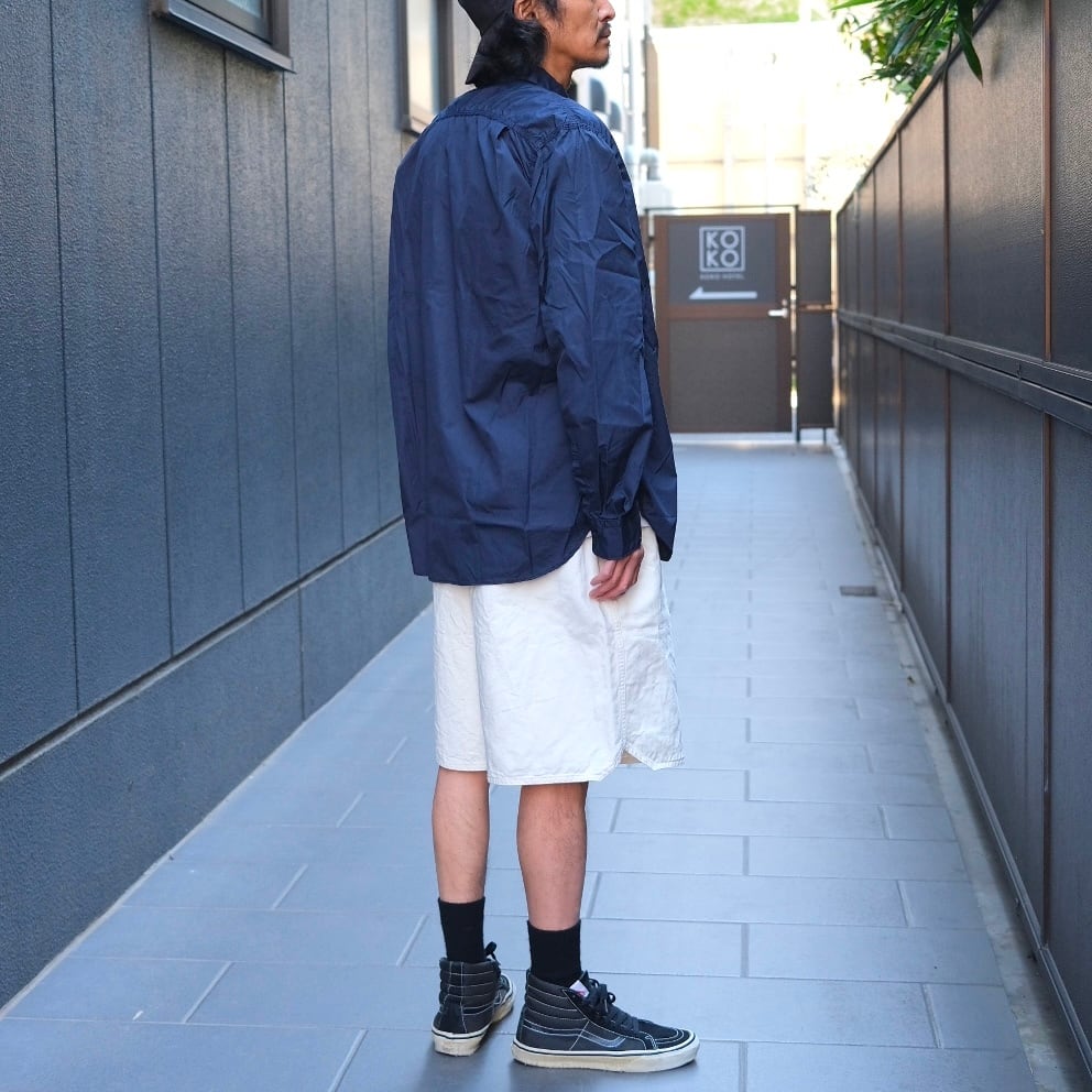 経糸にオーガニックコットン、緯糸にヘンプを交織したドリル素材はガサっとしたドライタッチな素材を製品染めしております。